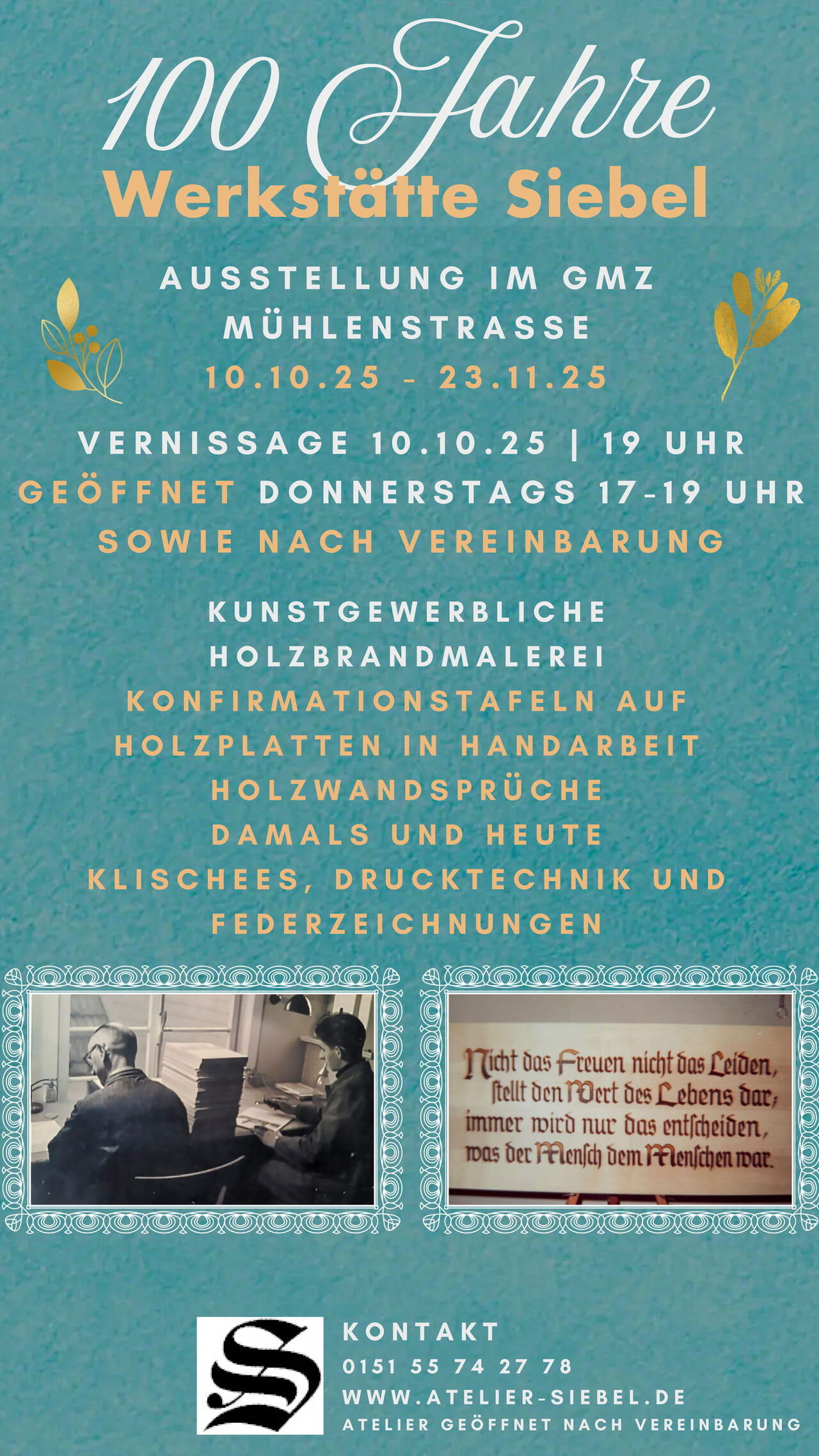 Das Jubiläum ist Anlass einer Ausstellung, die ab dem 10. Oktober im Gemeindezentrum (Mühlenstr. 25 Frdbg.-Büschergrund) der Evangelischen Kirchengemeinde Freudenberg zu sehen sein wird. Gezeigt wird die Kunst der Holzbrandmalerei in ihren unterschiedlichen Facetten. Besonderheit dabei sind die in Holzbrand erstellten Konfirmationstafeln, die von der Werkstätte Siebel an Kirchengemeinden in ganz Deutschland geliefert wurden - bis hin zur Kirchengemeinde auf der Nordseeinsel Helgoland.