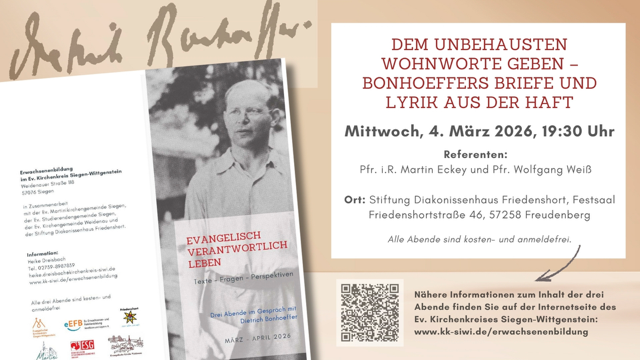 An diesem Abend kommen vor allem Bonhoeffers eigene Worte zu Gehör. Die ausgewählten Briefe und Gedichte eröffnen Einblicke in sein Denken und seinen Glauben und laden dazu ein, ungewohnte Perspektiven auf Theologie, Kirche und das eigene Leben zu entdecken. Die Teilnehmenden erhalten einen unmittelbaren Zugang zu Bonhoeffers Gefängnistexte und lernen, seine Briefe und Gedichte als Zeugnisse persönlichen Glaubens, ethischer Verantwortung und theologischer Reflexion zu lesen. Sie erfahren, wie Bonhoeffer mit existenzieller Bedrängnis umgeht, und werden angeregt, eigene Fragen nach Sinn, Glaube und Handeln in schwierigen Lebenssituationen zu stellen. Darüber hinaus schärft die Auseinandersetzung mit seinen Texten das Verständnis dafür, wie Glaube heute nach dem Sinn der überlieferten Worte und nach neuen Ausdrucksformen zu fragen hat